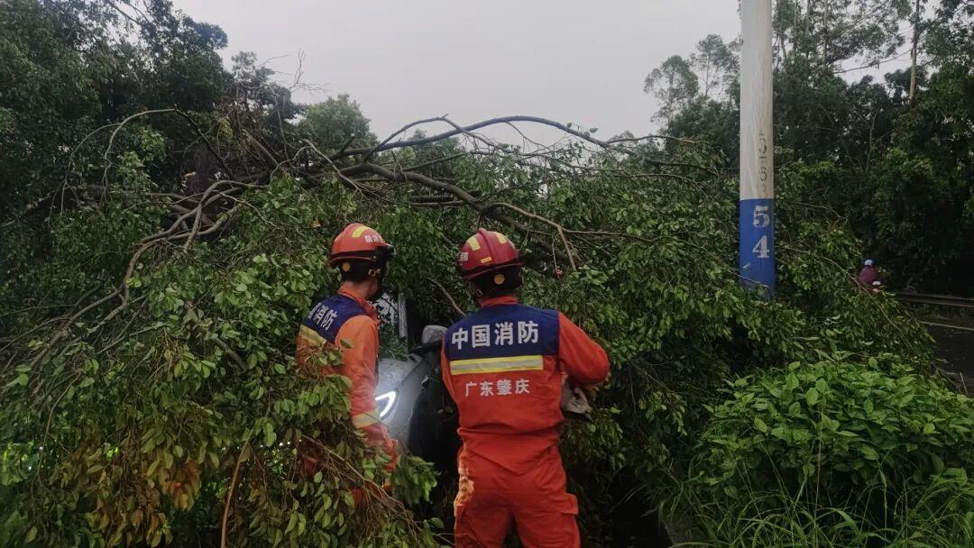 30日7时58分,在肇庆高要区,消防救援局接到110转警:南岸街道马安往新桥方向刚过马安红绿灯处,一辆小车被大风吹倒的树木压住,车内两人被困,情况紧急。