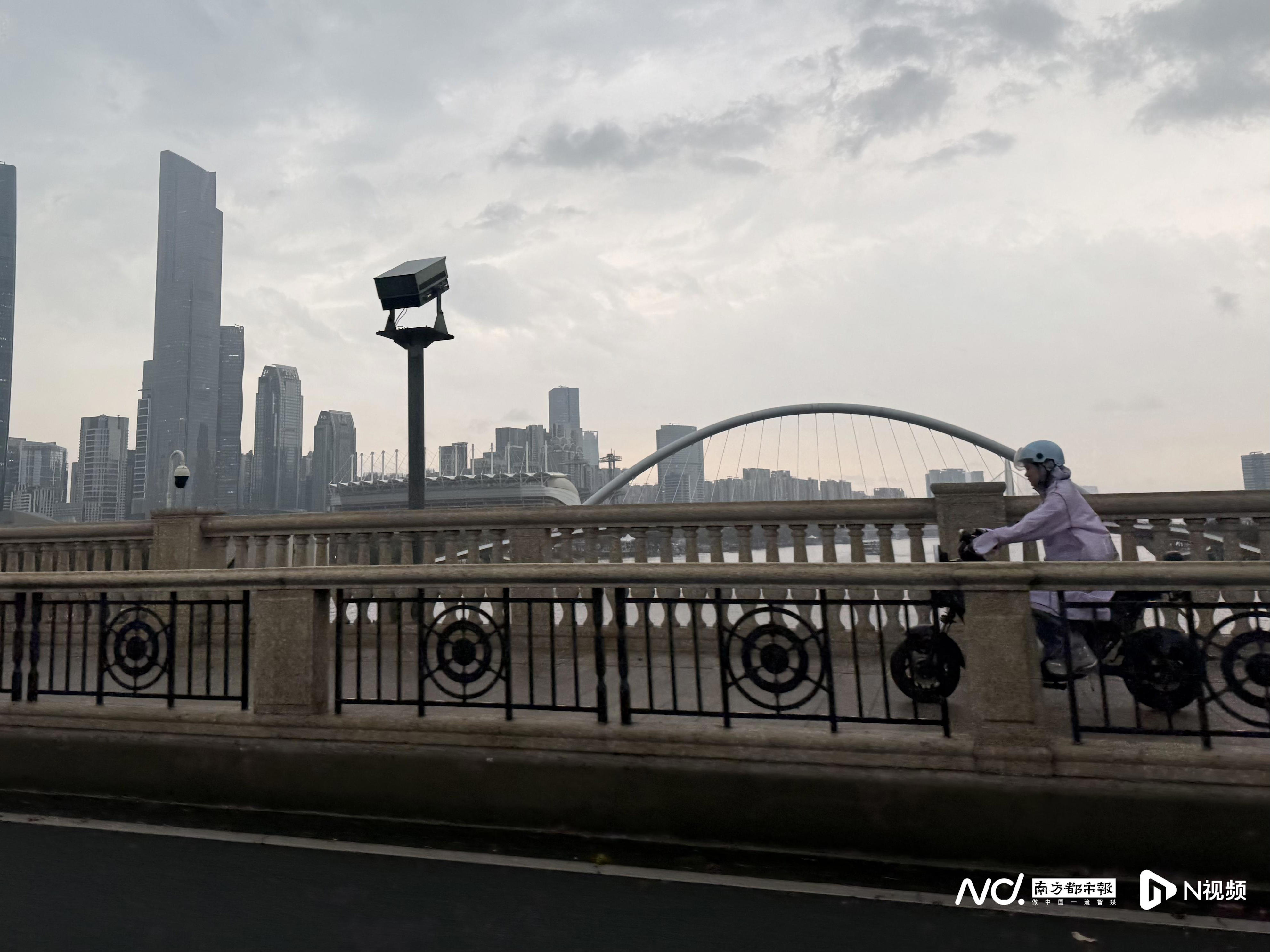 3月30日,身着雨衣的广州市民在桥上骑行。南都N视频记者 韦娟明 摄